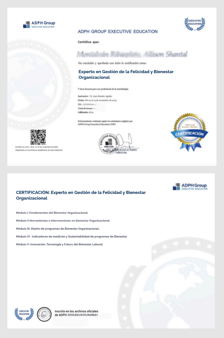 Una certificación otorgada por ADPH Group Executive Education, como: Experto en Gestión de la Felicidad y Bienestar Organizacional. Válido por un total de 250 horas académicas contabilizadas entre clases en vivo y trabajo práctico.